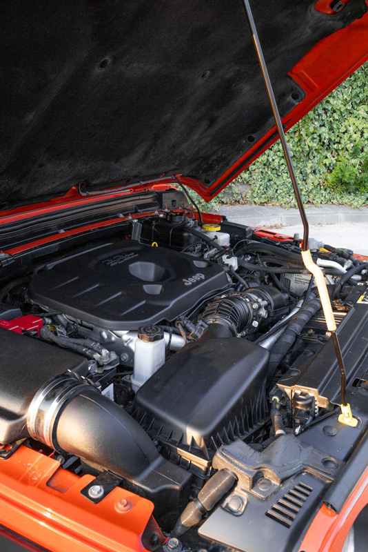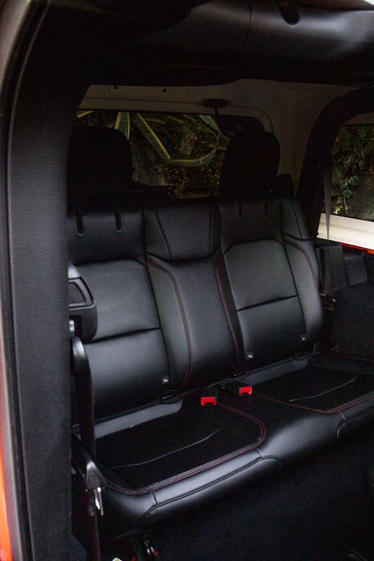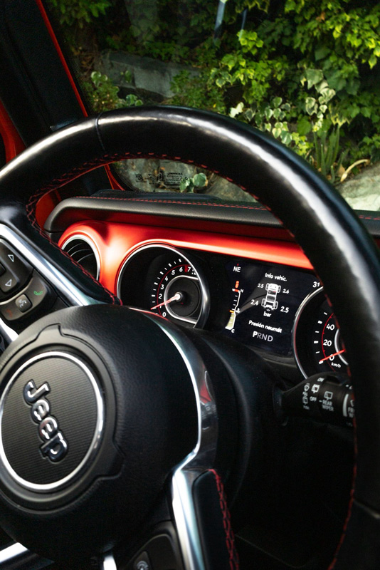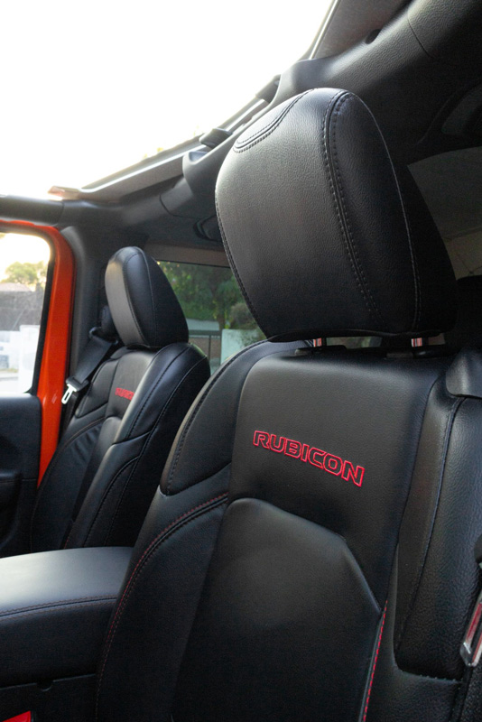 • Asientos en piel con bordados «Rubicon» en rojo, calefactables.